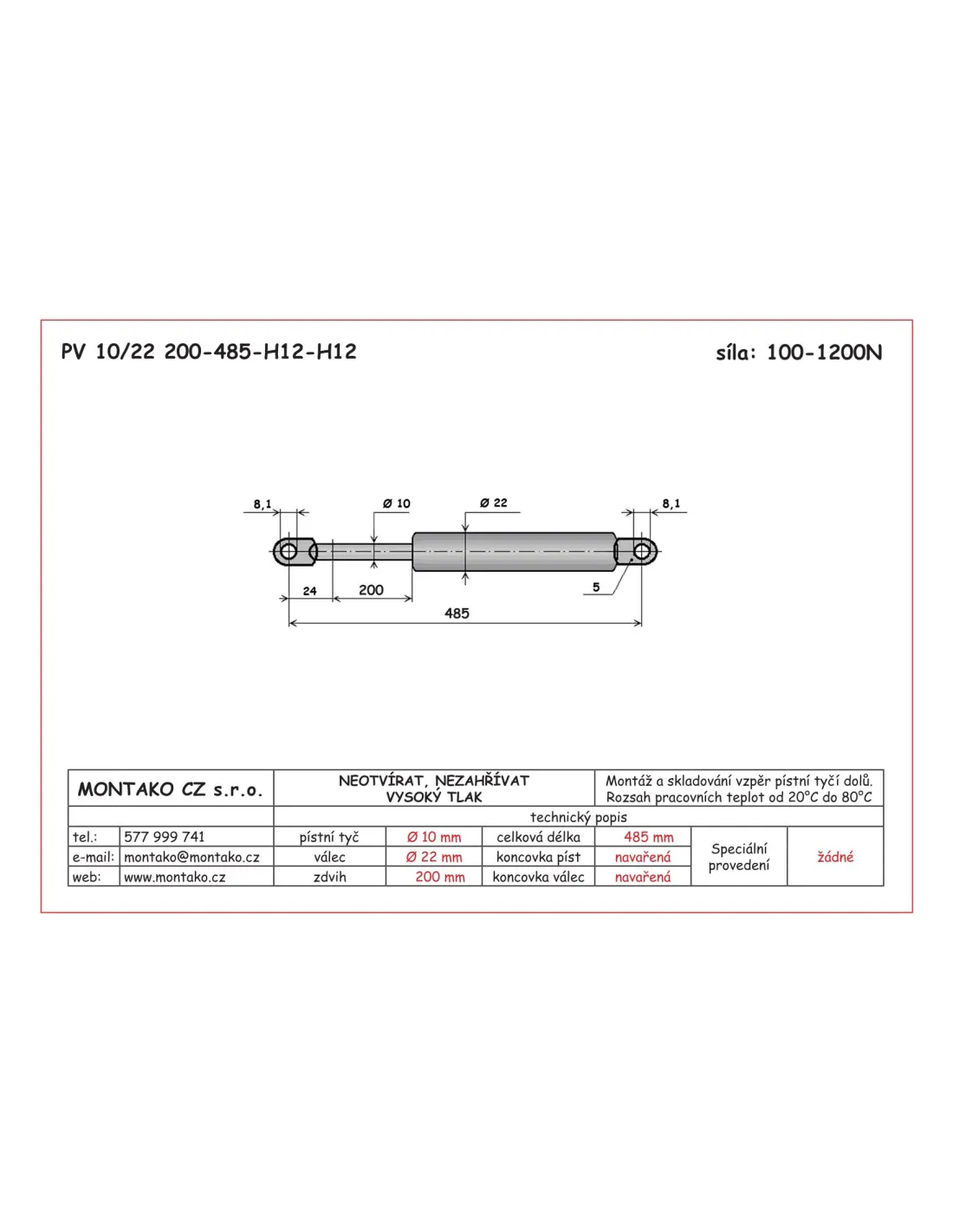 Plynová vzpěra PV 10/22 200-485-H12-H12