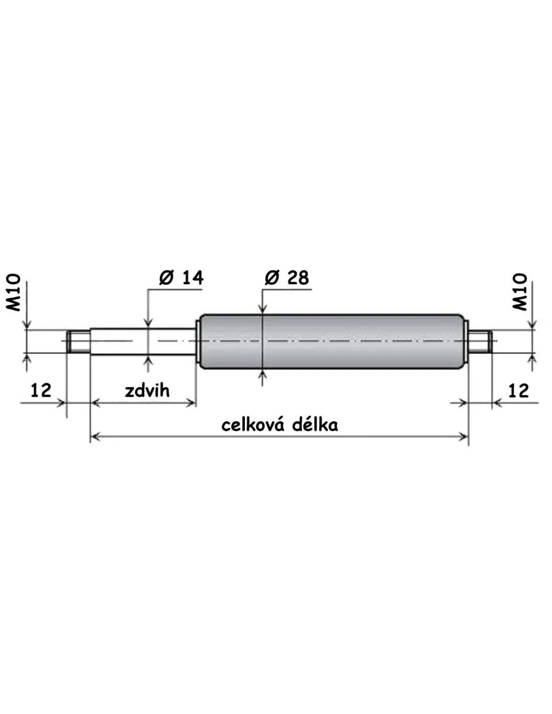 Plynová pružina se závitem 10 mm, průměr pístnice 14 mm, průměr válce 28 mm. Zabudování/skladování: svislé, pístnicí DOLŮ, odklon do 60°. Vysouvací rychlost: 0,2 ... 0,4 ms-1. Délka koncového tlumení: (20±10) mm. Teplotní rozsah použití: -30°C ... +80°C. Přípustné zatížení v tahu <2kN. Záruka: 50 000 zdvihů nebo 24 měsíců (co nastane dříve) při dodržení zabudovacích předpisů. Udaná síla F1 platí při teplotě 20°C. Na každých 10°C se mění síla o 3,4%.