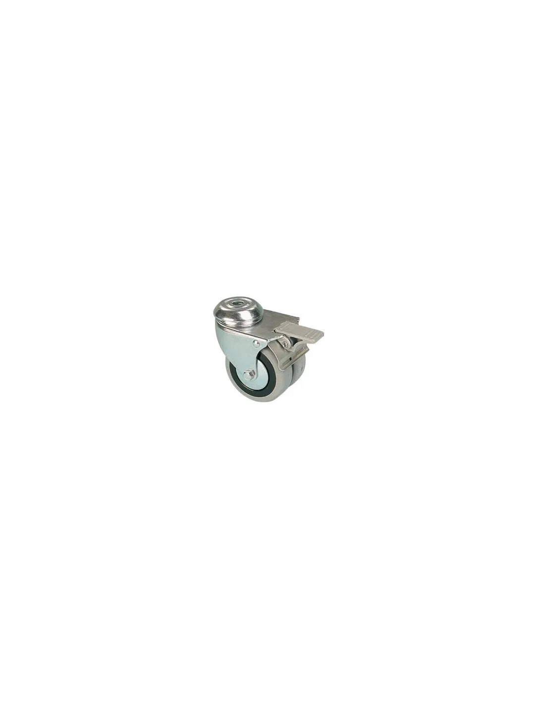 - vidlice z pozinkovaného ocelového plechu - dvě řady kuliček v otoči - otočné dvojkolo s otvorem v provedení s brzdou kol i otoče - kolo s polyamidovým diskem, šedou nešpinivou pryžovou obručí a dvěma protivláknovými krytkami - uložení kola v kluzném pouzdře