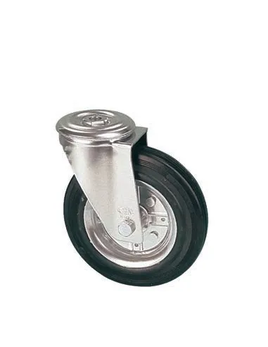 - vidlice z pozinkovaného ocelového plechu - dvě řady kuliček v otoči - otočné kolo v provedení s brzdou kola i otoče - kolo s kovovým diskem a černou pryžovou obručí - uložení kola v kuličkovém ložisku