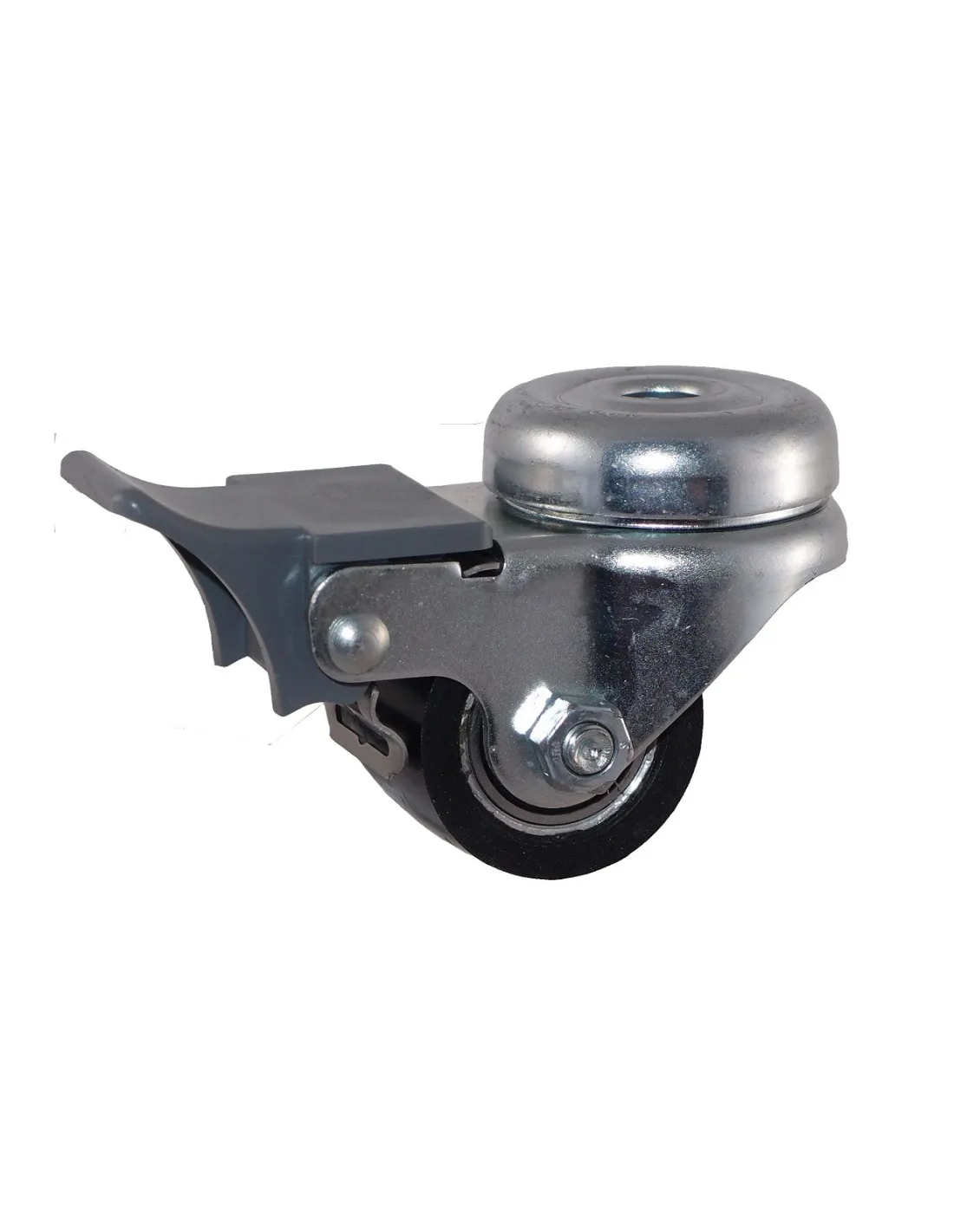 - vidlice z pozinkovaného ocelového plechu - dvě řady kuliček v otoči - otočné kolo s otvorem a s ocelovým diskem s polyuretanovou obručí 92 ShA - odolné teplotě -15°C až +60°C