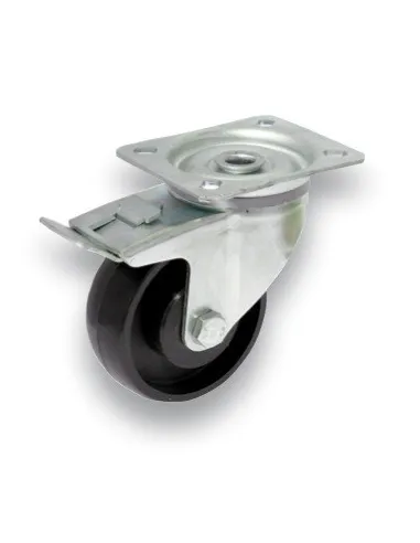 - vidlice z pozinkovaného ocelového plechu - dvě řady kuliček v otoči - otočné kolo s brzdou - černé polyamidové kolo - uložení kola v kuličkových ložiskách