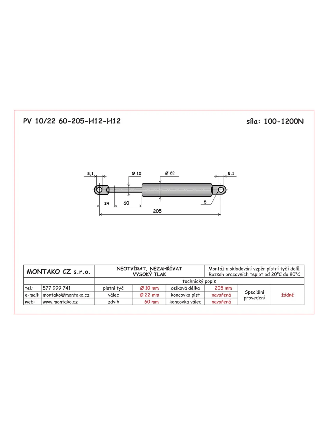 Zabudování /skladování: svislé, pístnicí dolů, odklon do 60° Vysouvací rychlost: 0,2 ... 0,4 ms-1 Délka koncového tlumení: (20±10)mm Teplotní rozsah použití: -20°C ... +80°C Přípustné zatížení v tahu <2kN Záruka: 50 000 zdvihů nebo 24 měsíců (co nastane dříve) při dodržení zabudovacích předpisů Udaná síla F1 platí při teplotě 20°C. Na každých 10°C se mění síla o 3,4%.