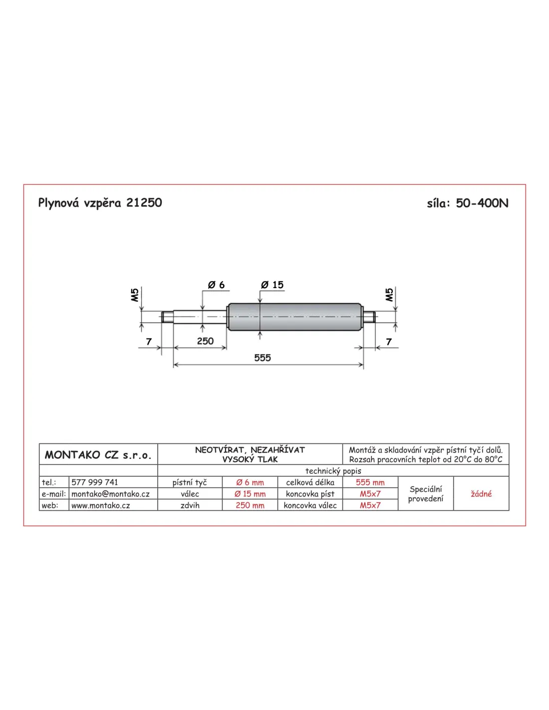 Plynová pružina se závitem 5 mm, průměr pístnice 6 mm, průměr válce 15 mm. Zabudování/skladování: svislé, pístnicí DOLŮ, odklon do 60°. Vysouvací rychlost: 0,2 ... 0,4 ms-1. Délka koncového tlumení: (20±10) mm. Teplotní rozsah použití: -30°C ... +80°C. Přípustné zatížení v tahu <2kN. Záruka: 50 000 zdvihů nebo 24 měsíců (co nastane dříve) při dodržení zabudovacích předpisů. Udaná síla F1 platí při teplotě 20°C. Na každých 10°C se mění síla o 3,4%.