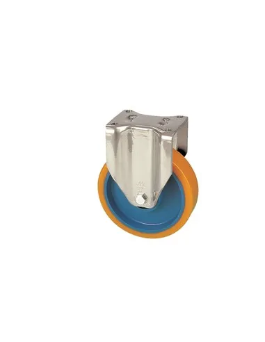 - vidlice z pozinkovaného ocelového plechu síly 5 mm - dvě řady kuliček v otoči - kolo pevné na kovovém disku s polyuretanovou obručí 96 ShA - uložení kola v kuličkovém ložisku - odolné chemickému prostředí
