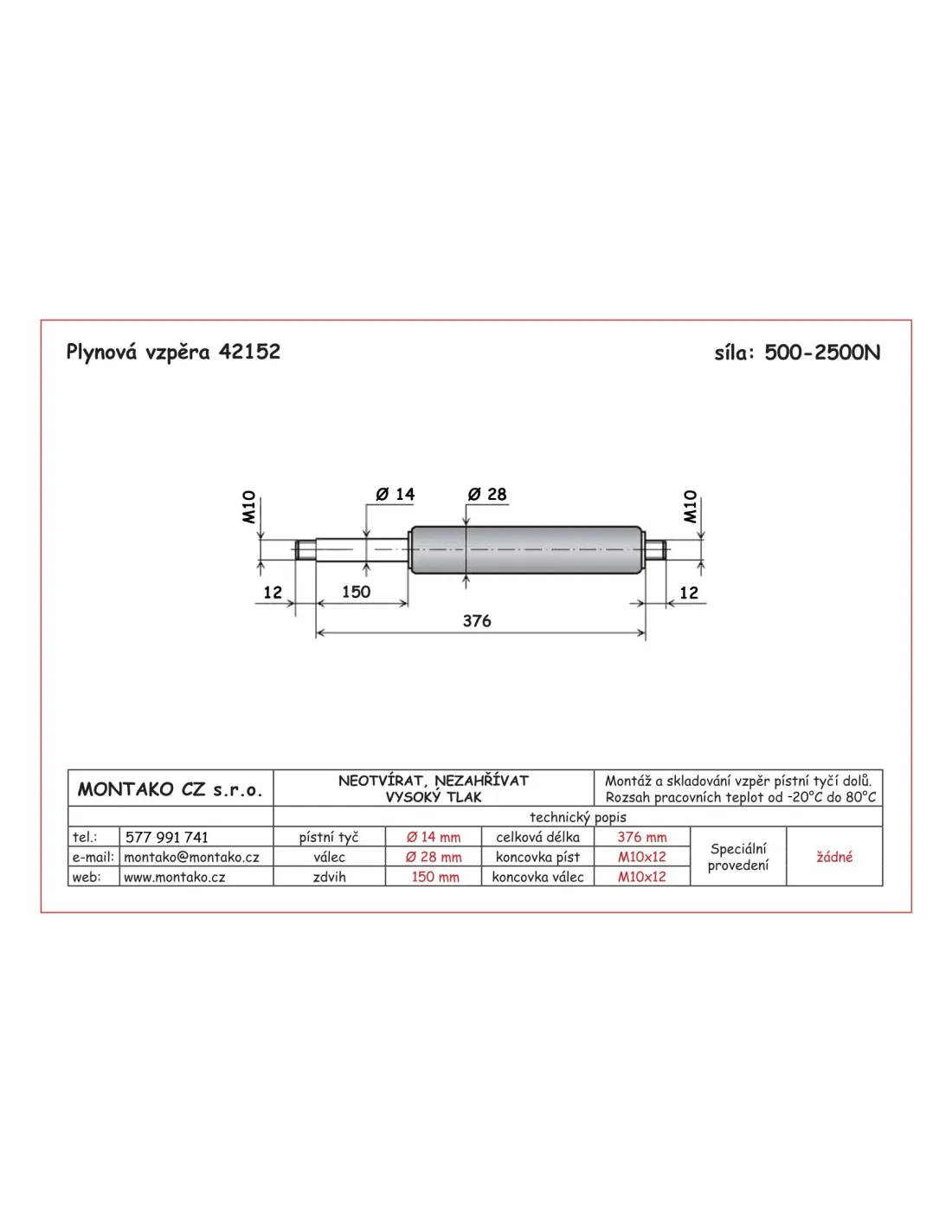 Plynová pružina se závitem 10 mm, průměr pístnice 14 mm, průměr válce 28 mm. Zabudování/skladování: svislé, pístnicí DOLŮ, odklon do 60°. Vysouvací rychlost: 0,2 ... 0,4 ms-1. Délka koncového tlumení: (20±10) mm. Teplotní rozsah použití: -30°C ... +80°C. Přípustné zatížení v tahu <2kN. Záruka: 50 000 zdvihů nebo 24 měsíců (co nastane dříve) při dodržení zabudovacích předpisů. Udaná síla F1 platí při teplotě 20°C. Na každých 10°C se mění síla o 3,4%.