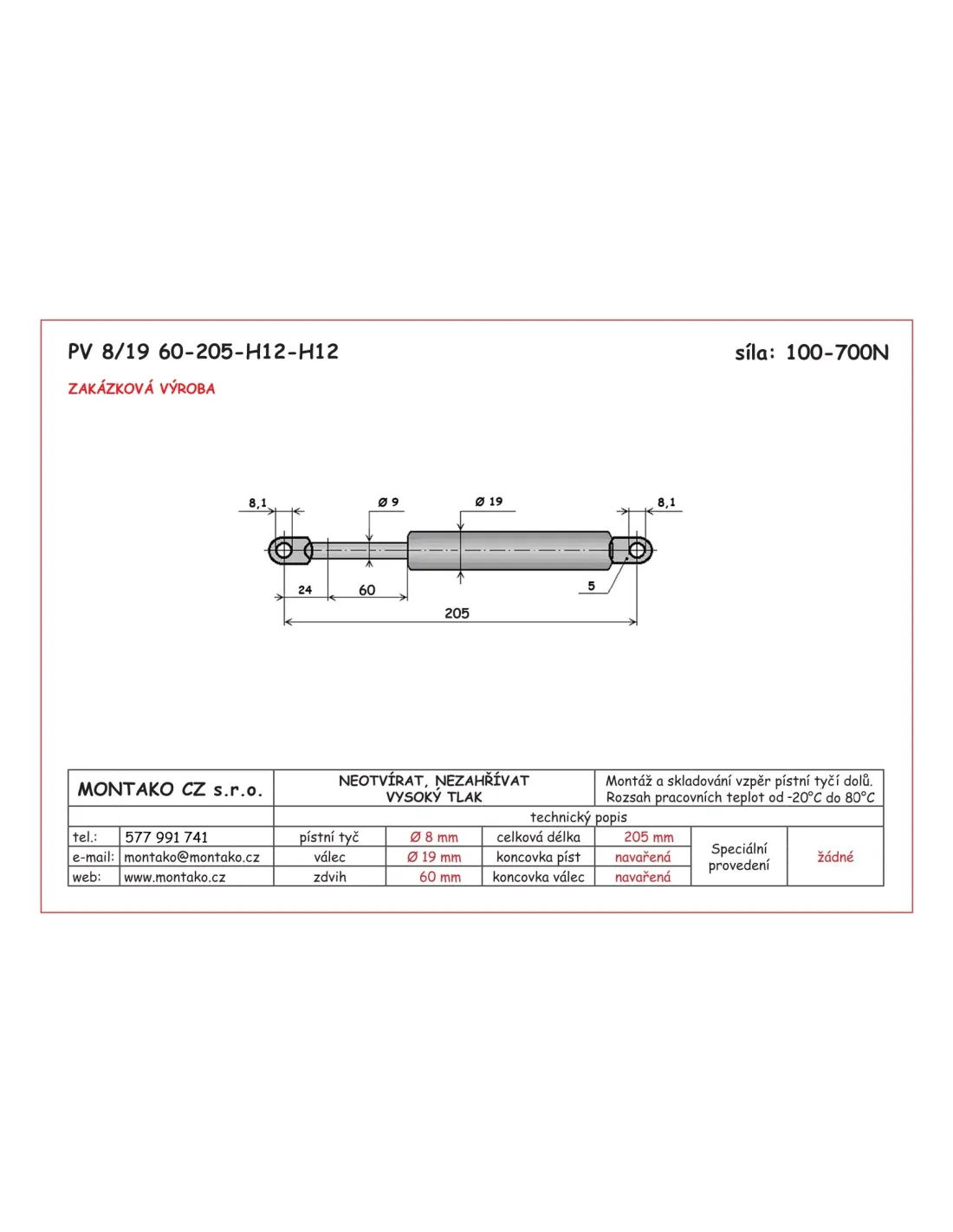 Plynová vzpěra PV 8/19 60-205-H12-H12